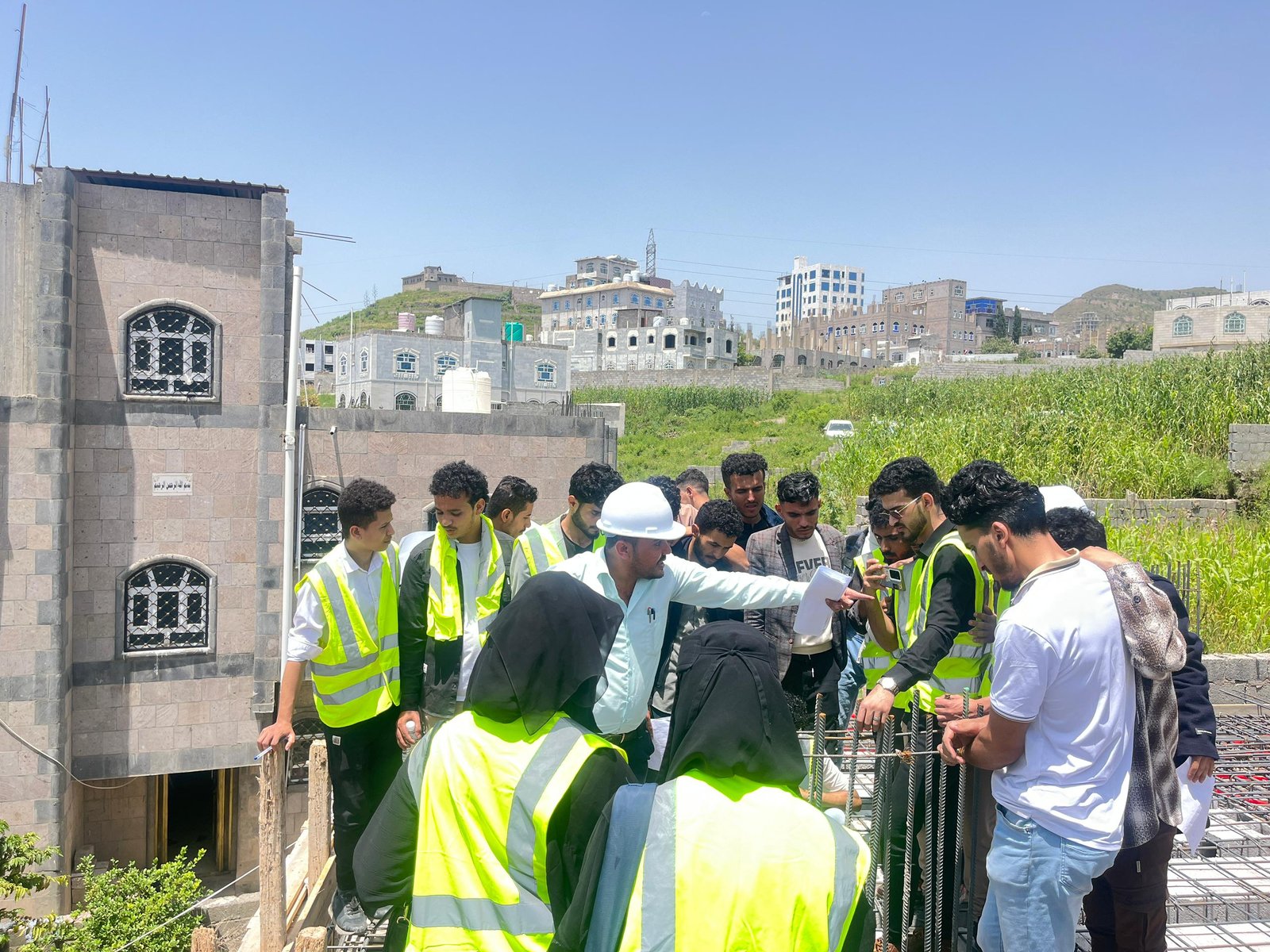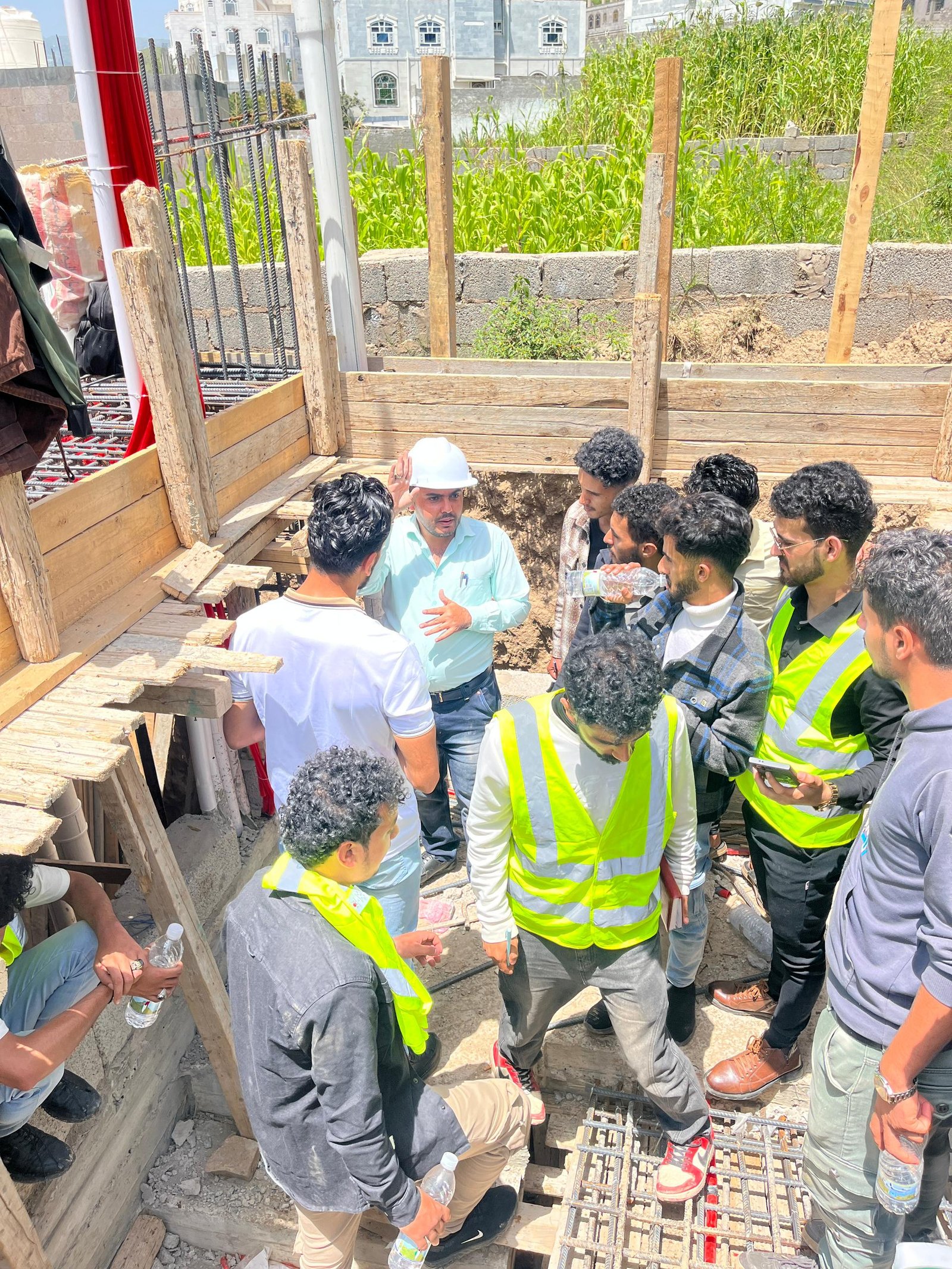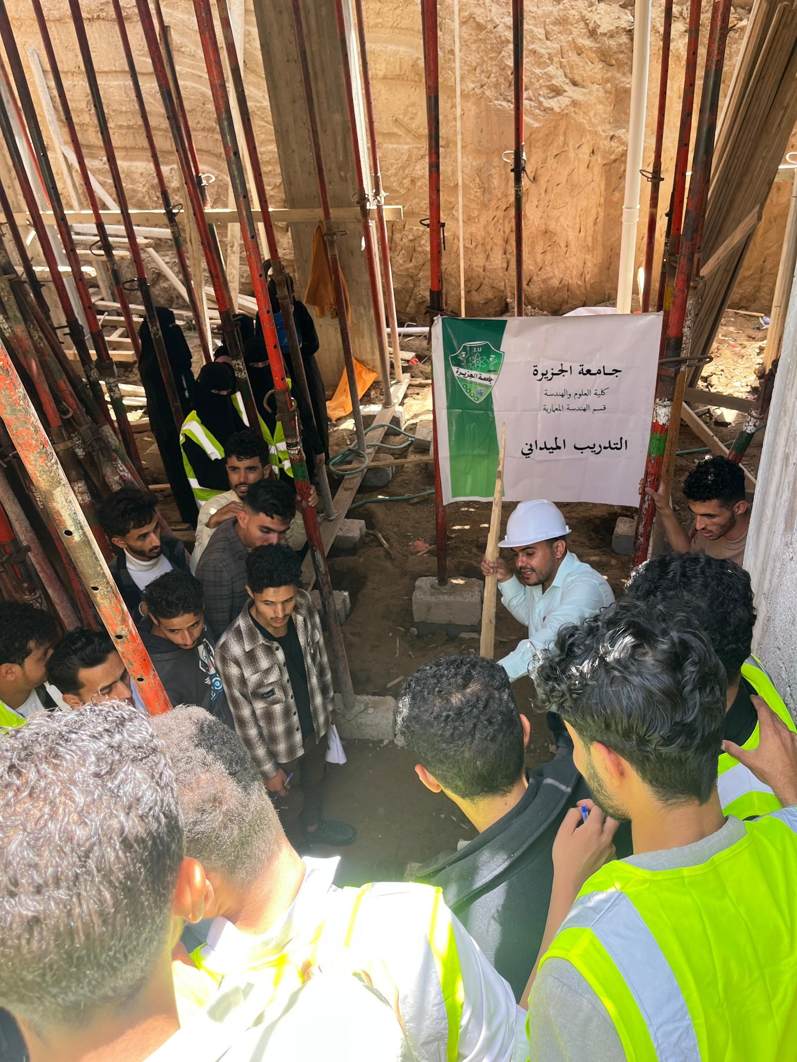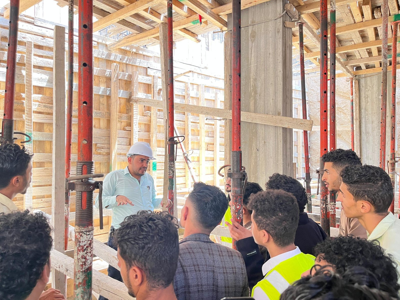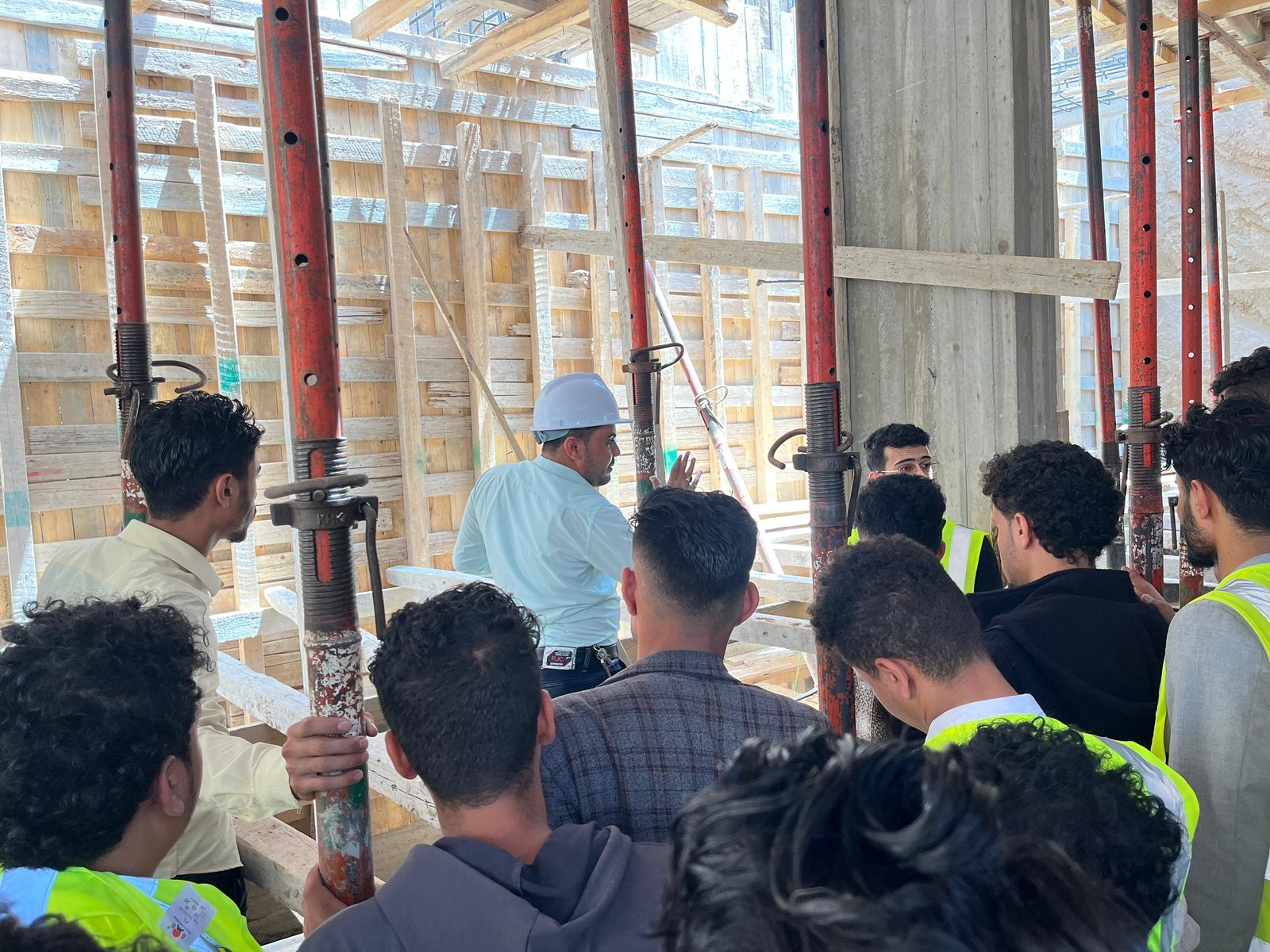 وفي الزيارة التي رافق الطلبة فيها الاستشاريون المهندس: عمرو الجبري منسق القسم، والمهندس: عيسى العرومي عضو هيئة التدريس، واللذان قدما شرحاً تفصيلياً للأعمال الجارية في موقع العمل والمتمثلة في أعمال النجارة والحدادة المسلحة لأحد أسطح المباني، وأعمال التأسيس للتمديدات الصحية والكهربية، بهدف تدريب الطلبة على استلام بنود الأعمال على أرض الواقع، وفقاً للمعاير والشروط الهندسية.